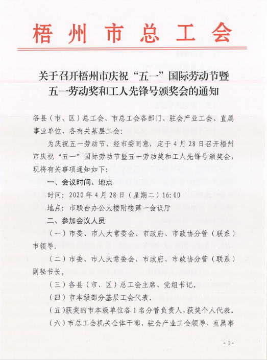 關(guān)于召開(kāi)梧州市慶祝“五一”國(guó)際勞動(dòng)節(jié)暨五一勞動(dòng)獎(jiǎng)和工人先鋒號(hào)頒獎(jiǎng)大會(huì)的通知