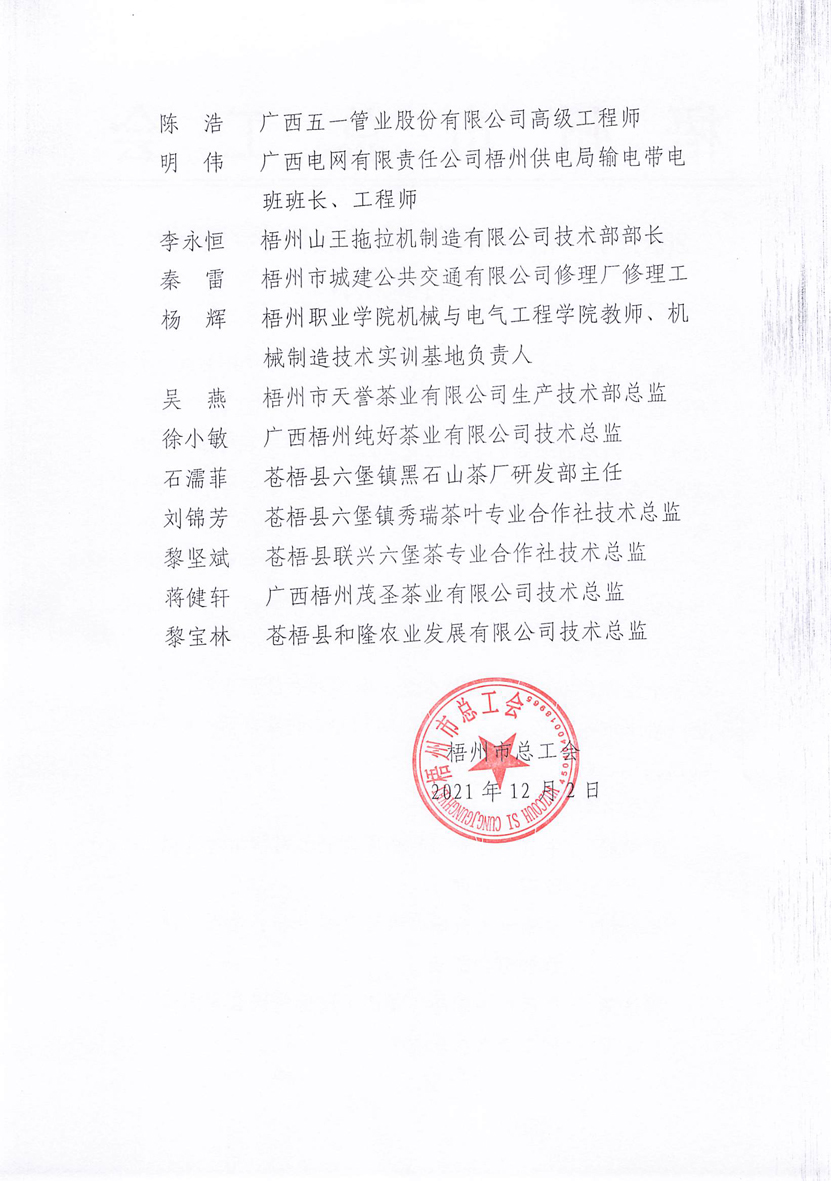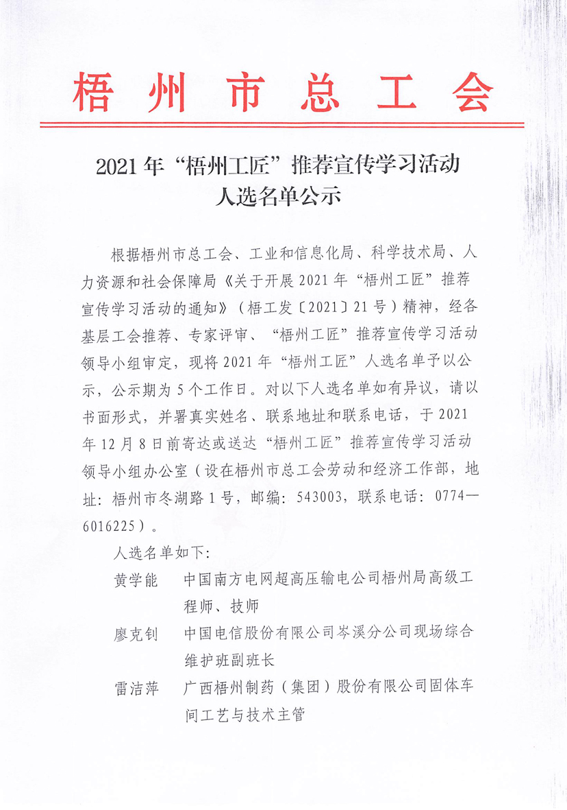 2021年“梧州工匠”推薦宣傳學習活動人選名單公示