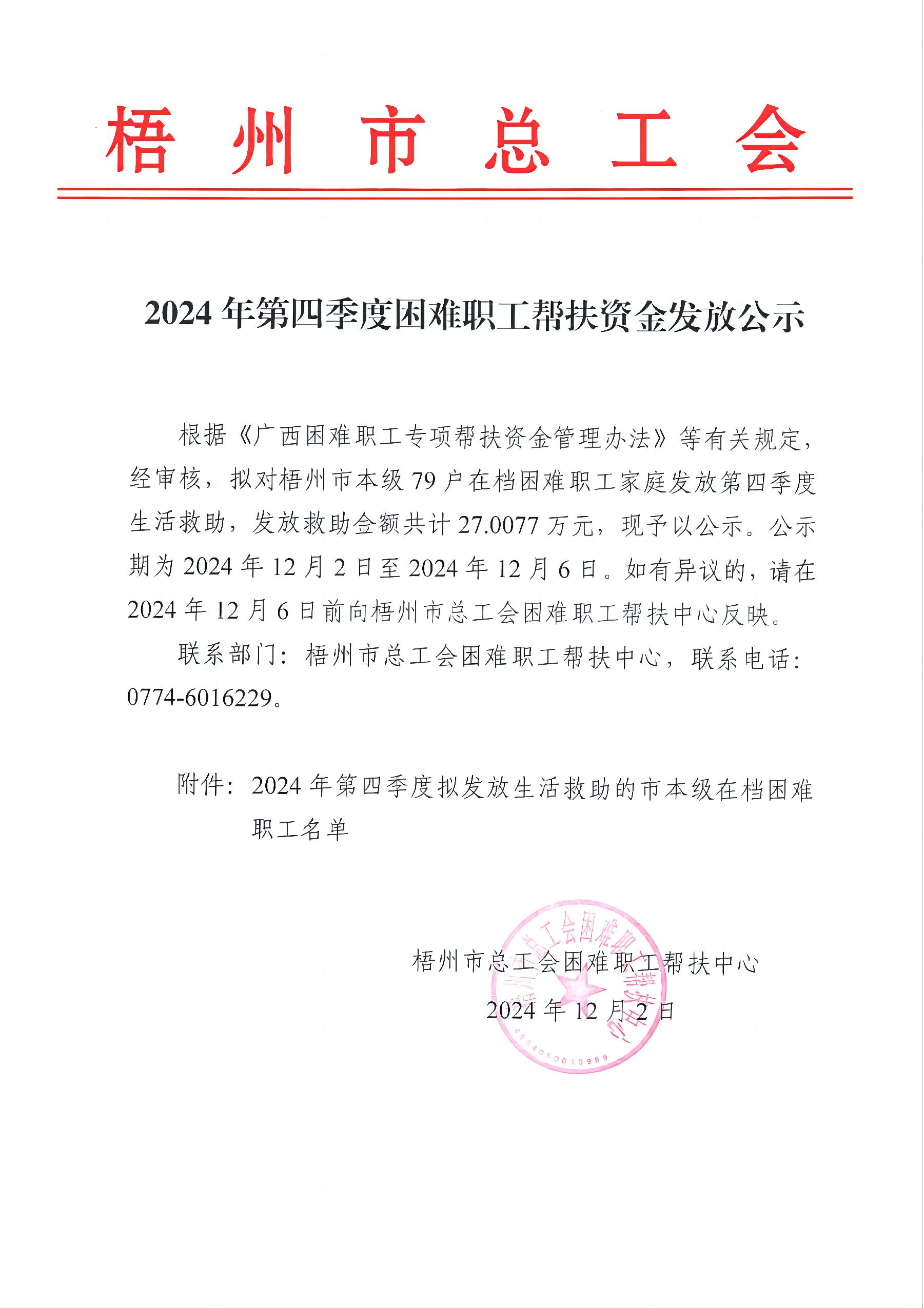 2024年第四季度困難職工幫扶資金發(fā)放公示