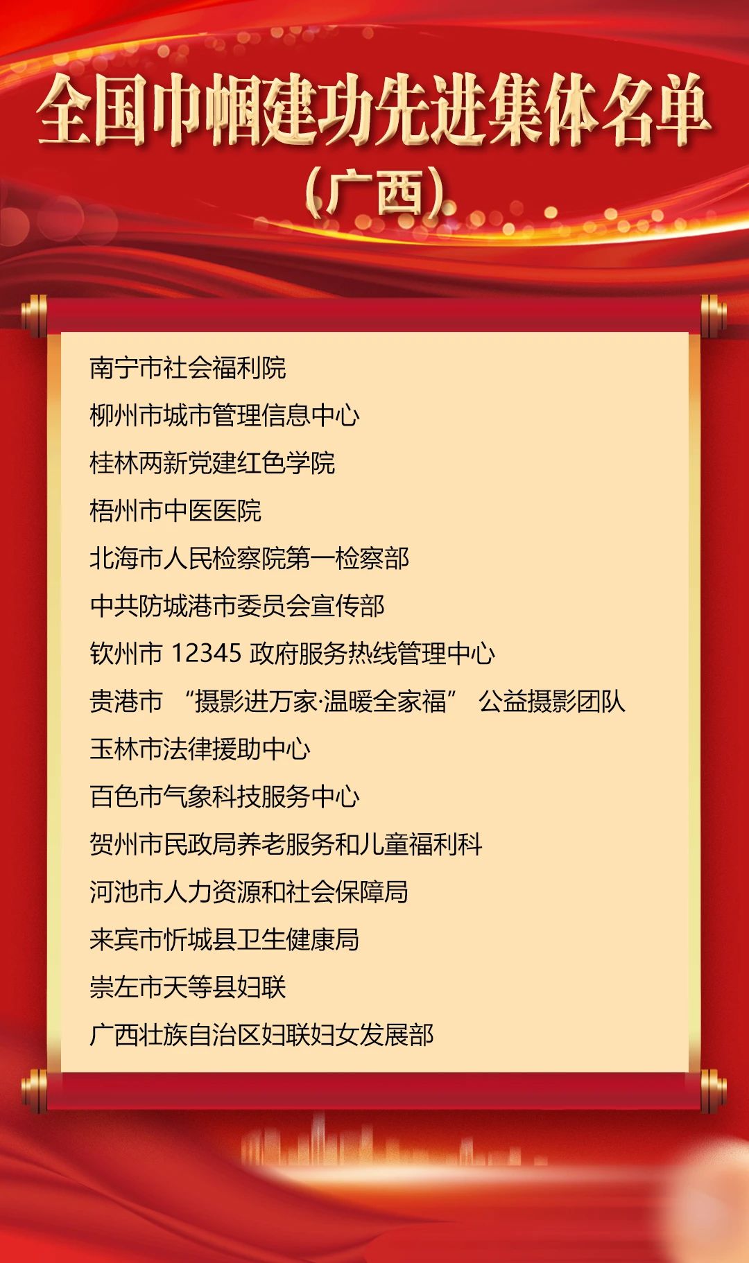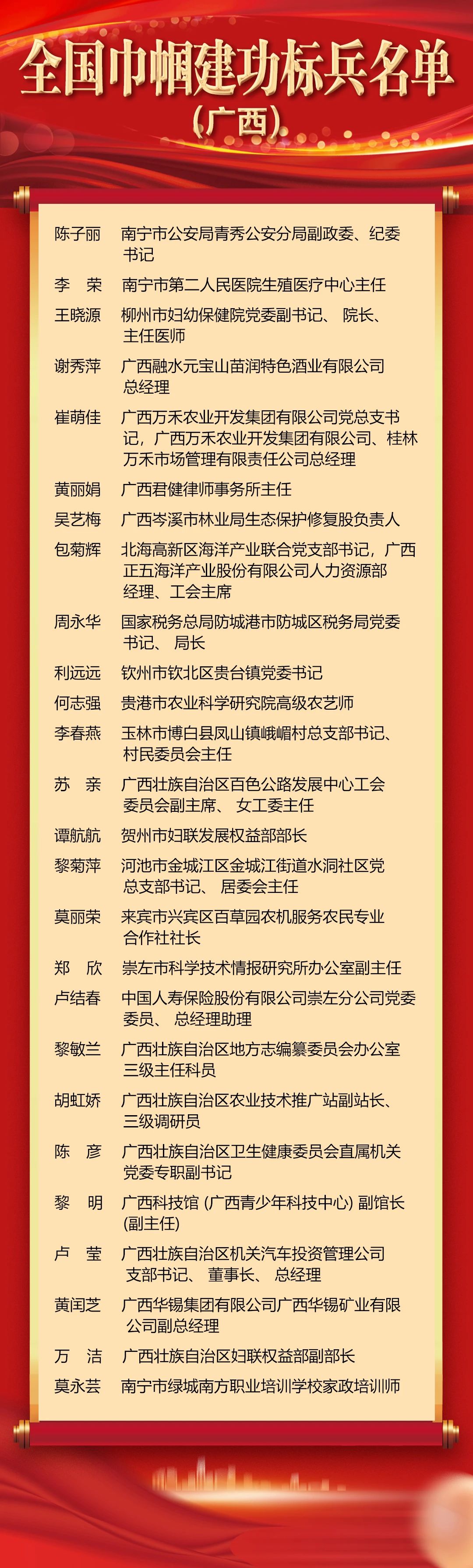 廣西獲獎的個人和集體當(dāng)中,陳曉軍等9人被授予全國三八紅旗手稱號;廣西右江民族商業(yè)學(xué)校等7個集體被授予全國三八紅旗集體稱號;南寧市疾病預(yù)防控制中心微生物檢驗科等54個集體被授予全國巾幗文明崗稱號;陳子麗等26人被授予全國巾幗建功標(biāo)兵稱號;南寧市社會福利院等15個集體被授予全國巾幗建功先進集體稱號。